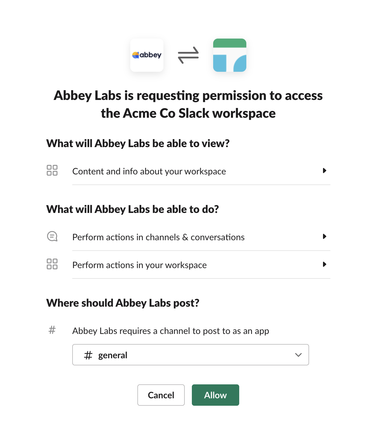 After clicking "Add to Slack", you'll be directed to an app install page by Slack. Pick a channel - any channel is fine, we only sends DMs to users for notifications.