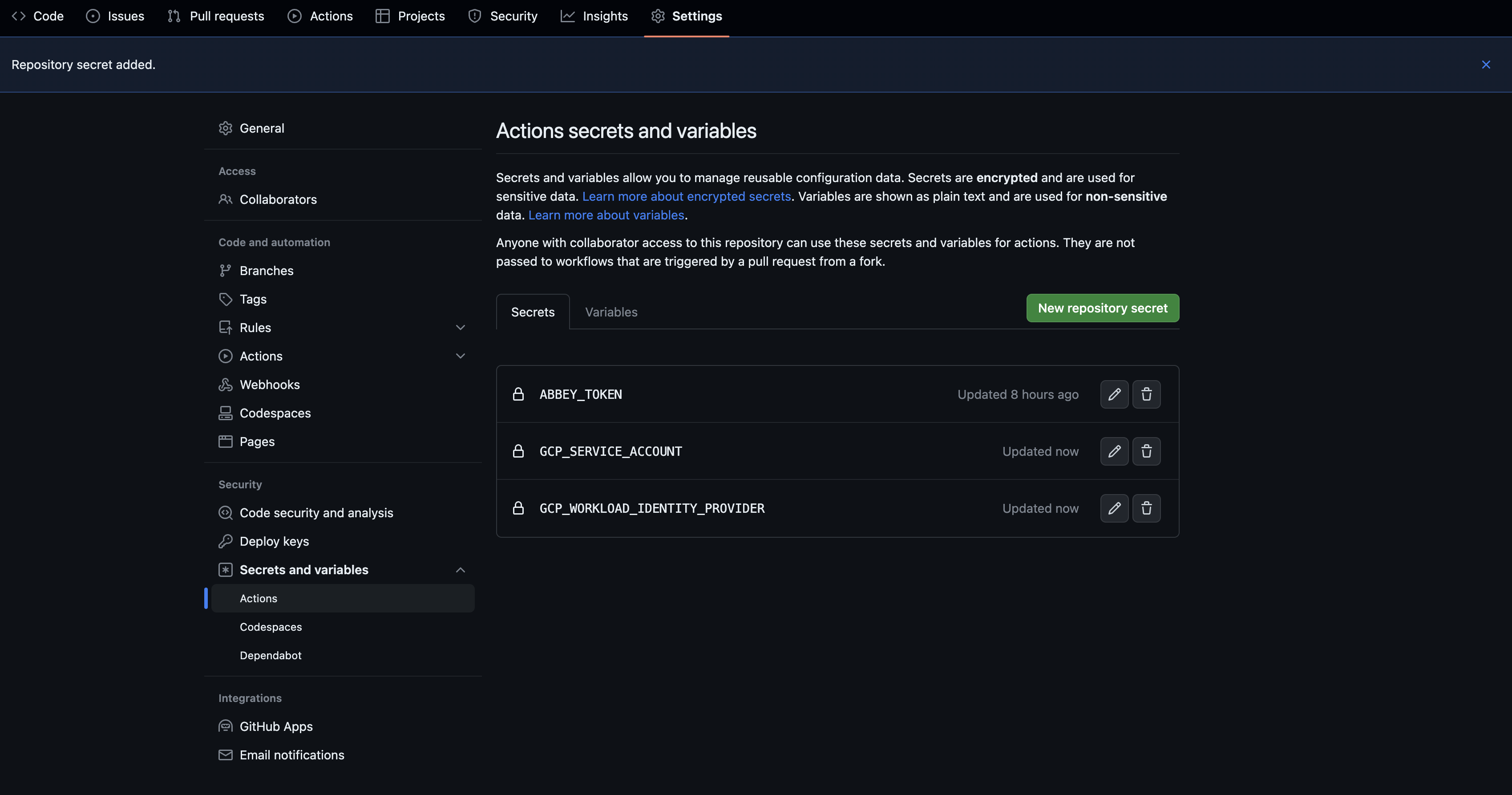 * Add Repository Secrets so Github Actions to make calls to GCP