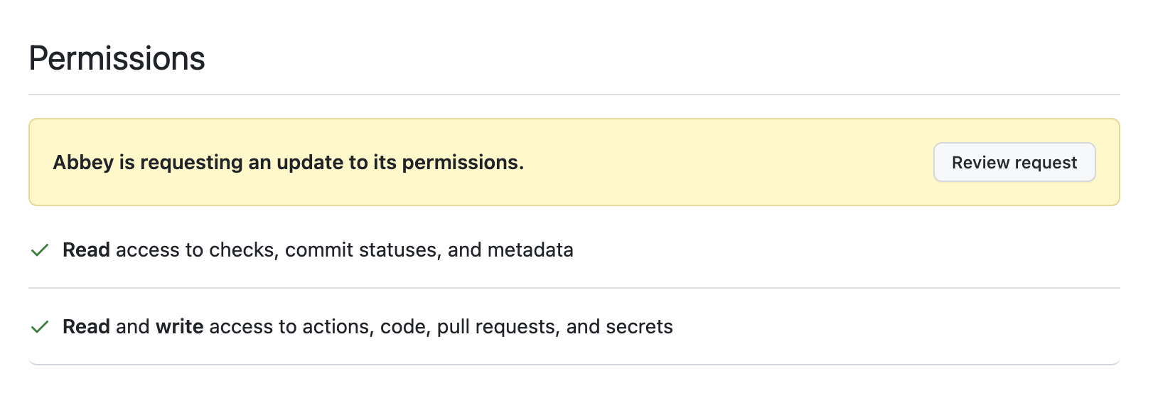 * This may happen if you have not granted the Abbey GitHub App the correct permissions. Check that there isn't a permissions request at **Settings** -> **GitHub Apps** -> **Abbey Labs**&#x20;
